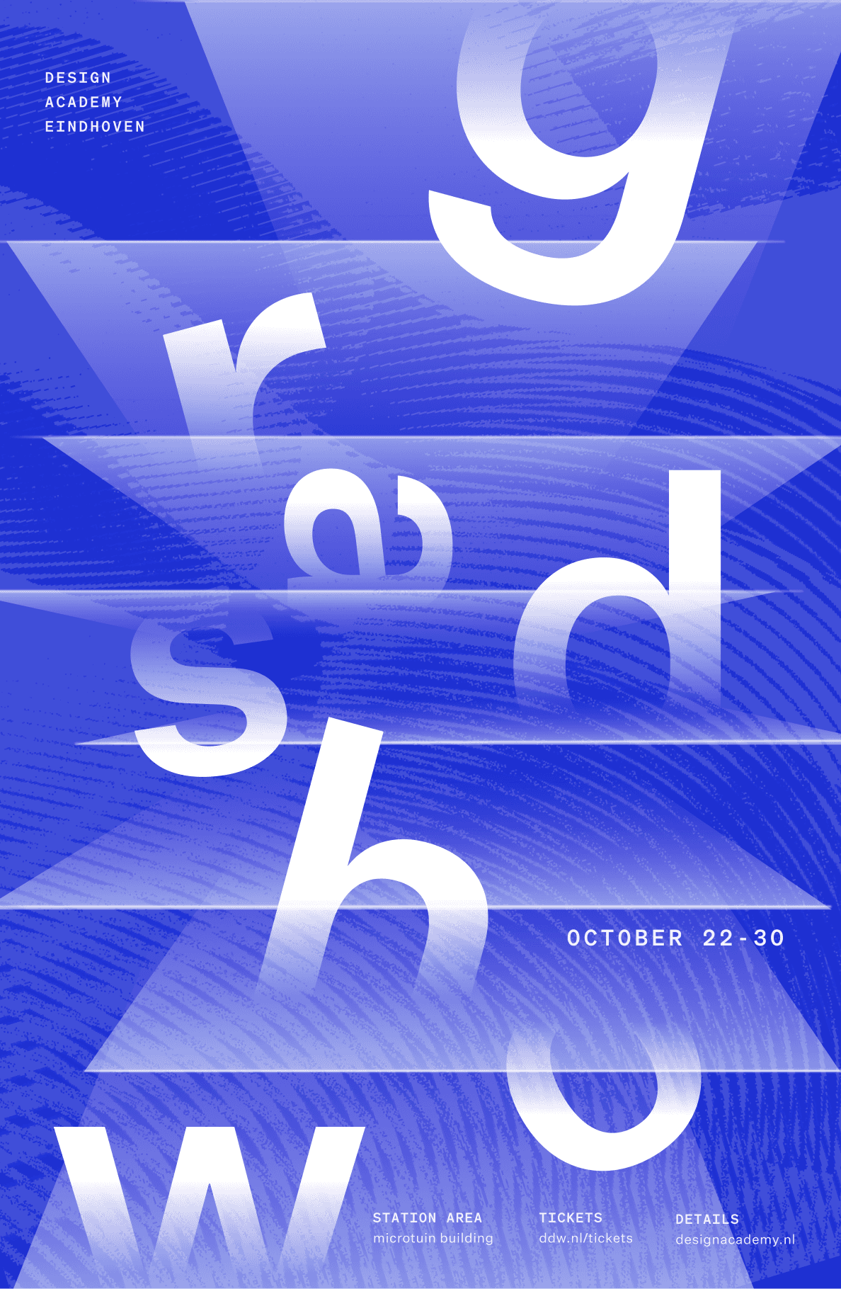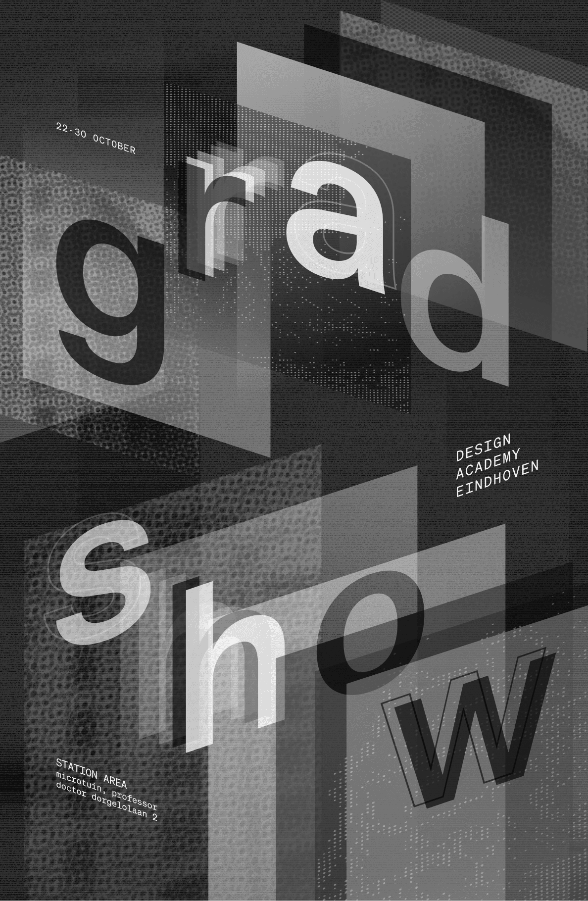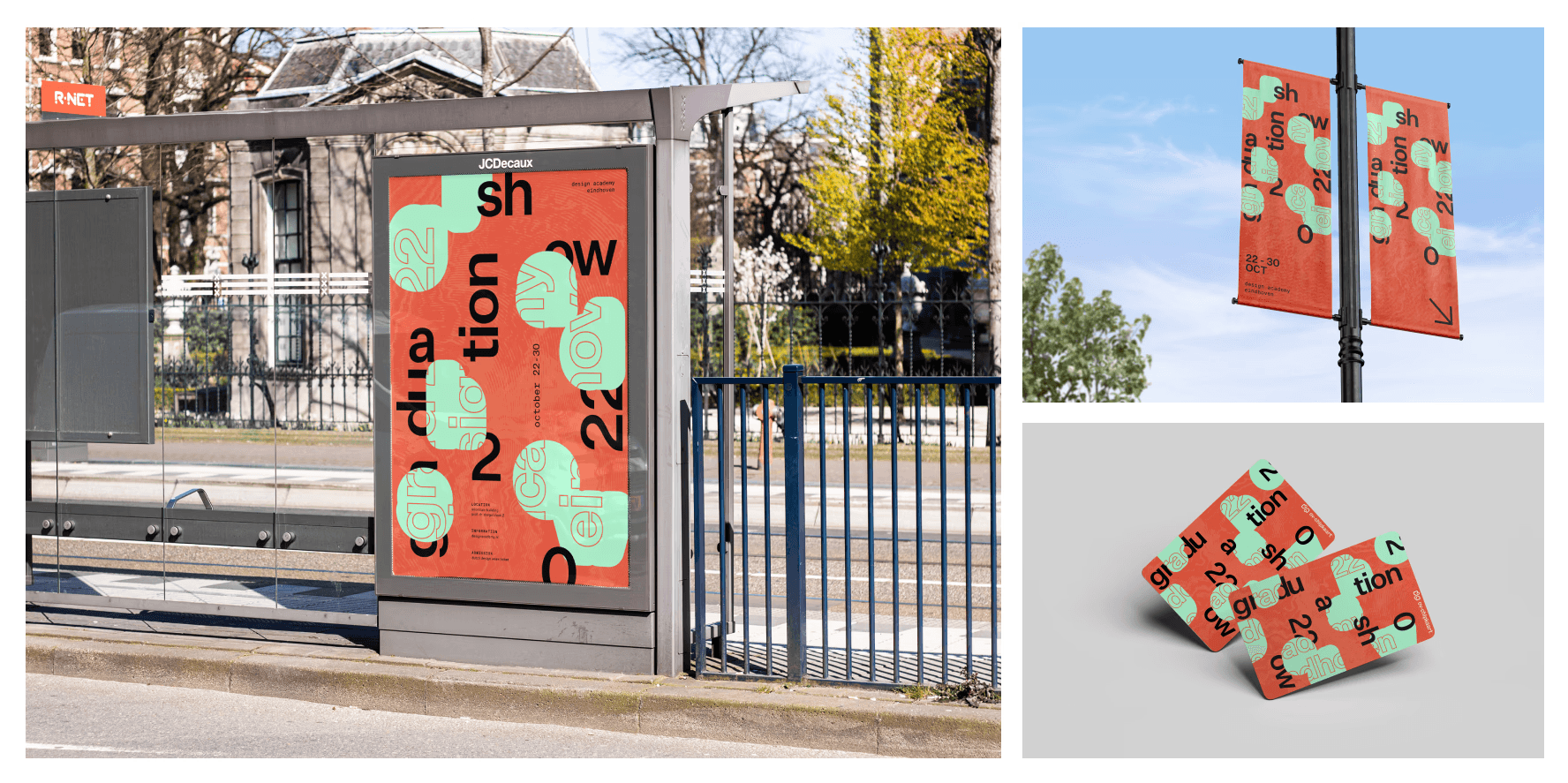 Graduation Show is an annual curated exhibition held during Dutch Design Week, consisting of Bachelor and Master multimedia student projects from the Design Academy Eindhoven. We designed 3 separate identities to promote this event, utilizing and adapting design qualities of the Amsterdam-based design studio, Experimental Jetset.