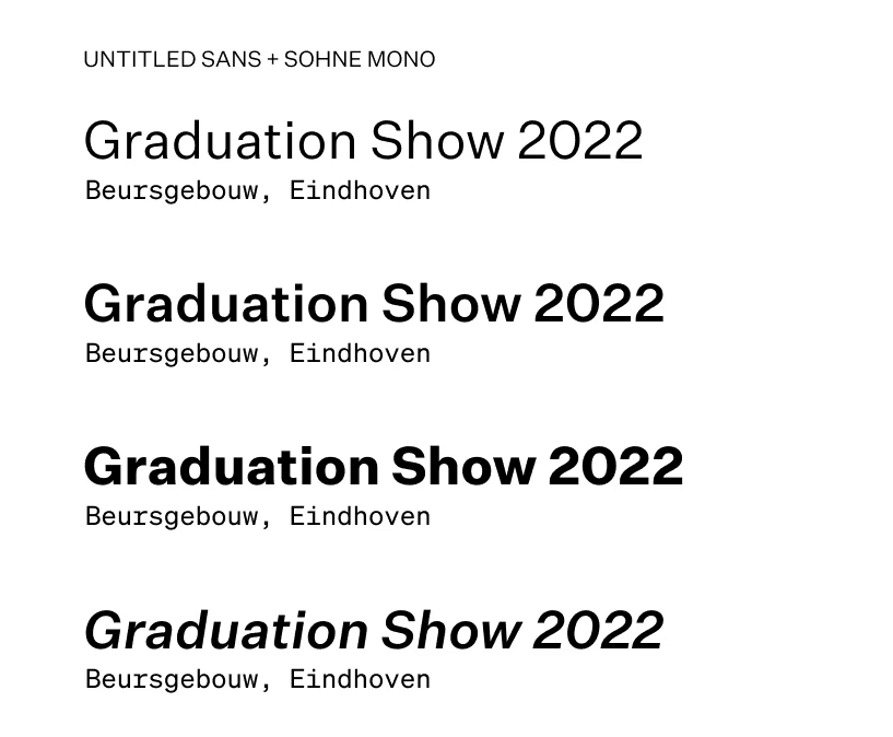 We wanted to break away from Experimental Jetset's heavy preference for using Helvetica, so I chose to use Untitled Sans and Söhne Mono from Klim Type Foundry, as we were recommended to find a sans serif and monospaced pairing.