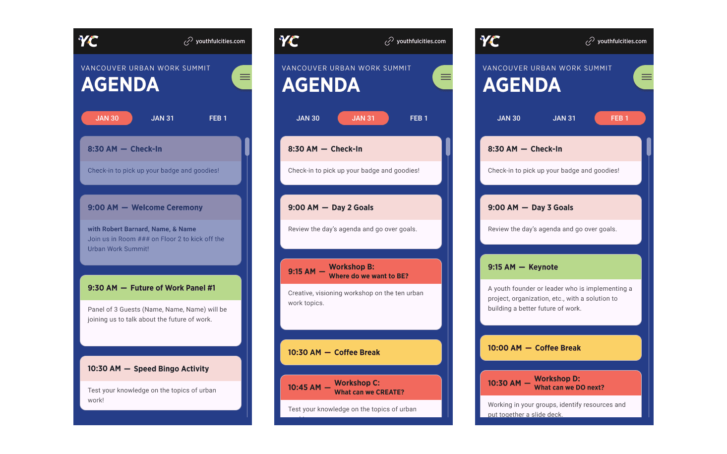 The Urban Work Summit took place across four major Canadian cities: Vancouver, Calgary, Toronto, and Montréal. This project focuses on the three-day event in Vancouver, where participants engaged in meaningful discussions aimed at addressing the skills gap for youth and youth employment. This digital schedule was designed to inform attendees about the day-to-day schedule, outlining specific workshops, speakers, and break periods.